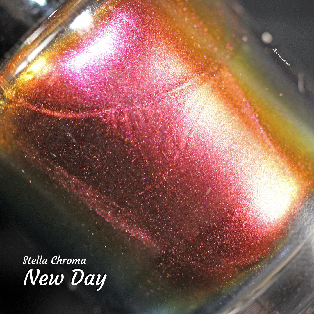 New Day is a multichrome polish that shines through magenta, orange, yellow, gold, and even green at extreme angles. Easy to apply and smooth as butter, this nail lacquer is opaque in 2 easy coats.