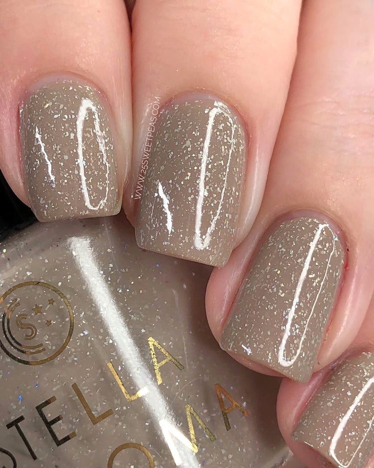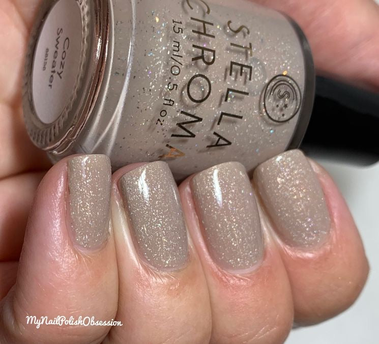 Cozy Sweater - We don't love EVERYTHING about winter here at STELLA CHROMA, but we do love soft, chunky knit sweaters that make you feel cozy wherever you are or whatever the temps! This taupe shade is a chameleon. Sometimes nude tan, sometimes purple-mauve, sometimes a mushroom color. It just depends on the light and your skin tone. A creamy dream to apply with holo flakies for sparkle. Opaque in two coats.