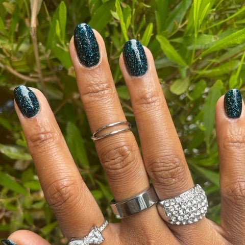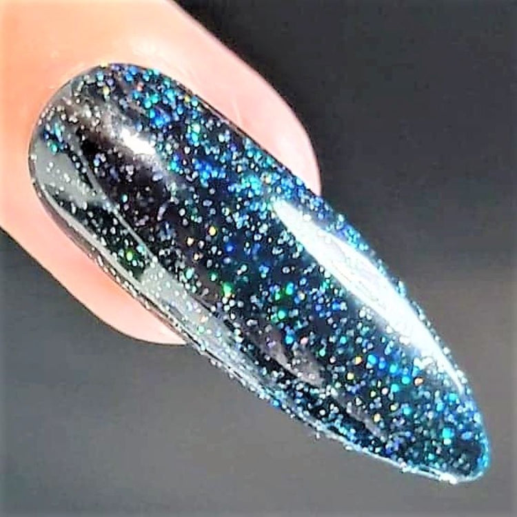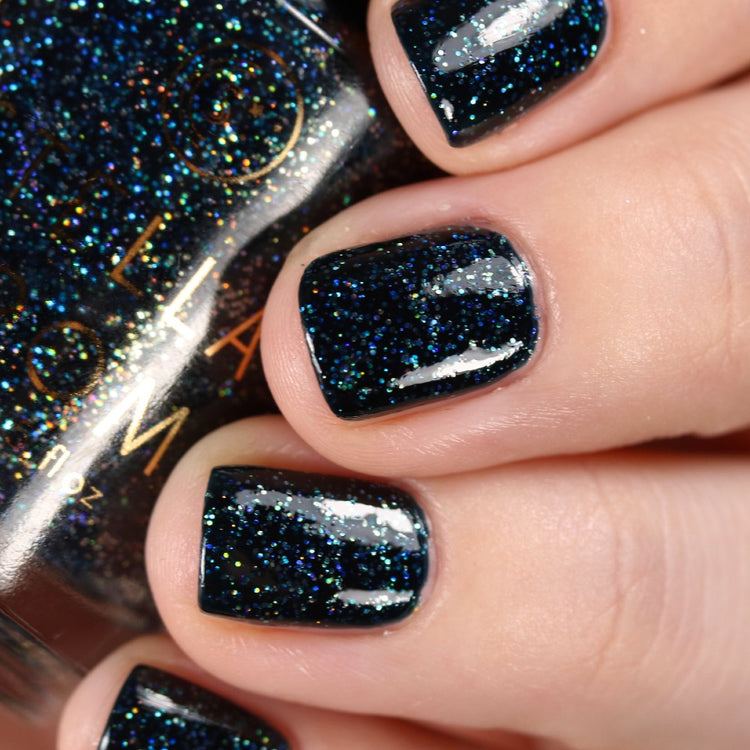 Heaven's Right Here - A squishy, inky navy blue creme base loaded with silver holographic glitters. Opaque in 2 coats.
