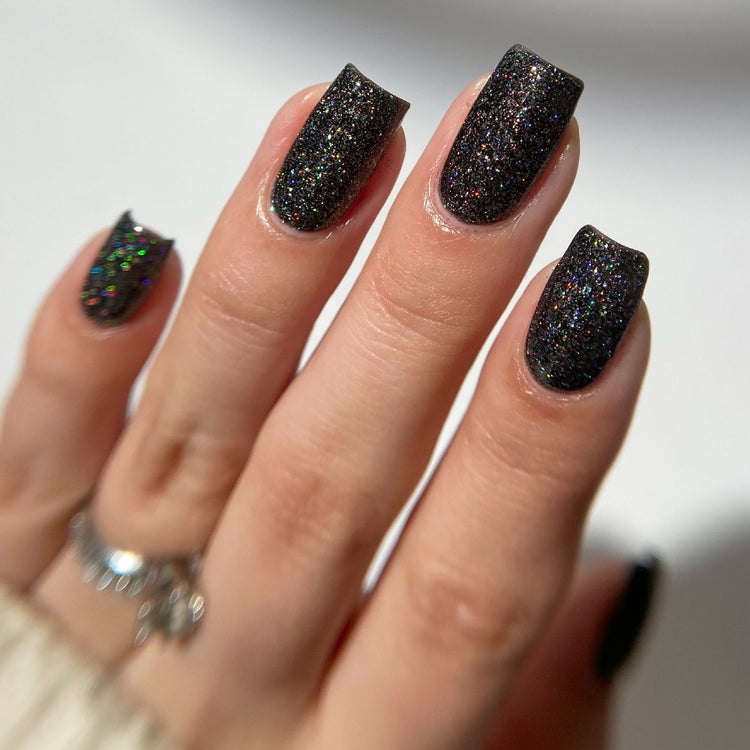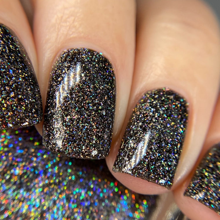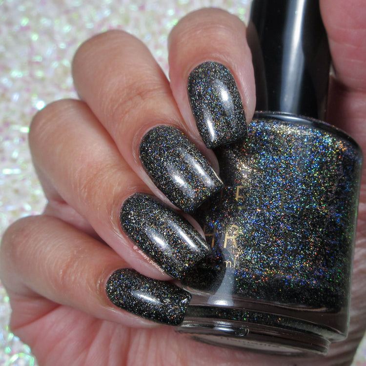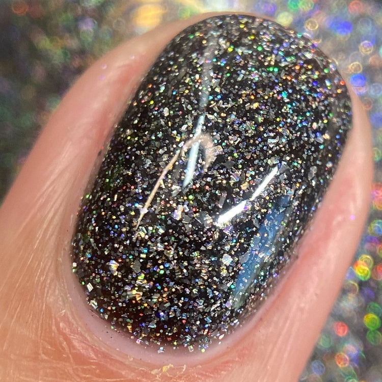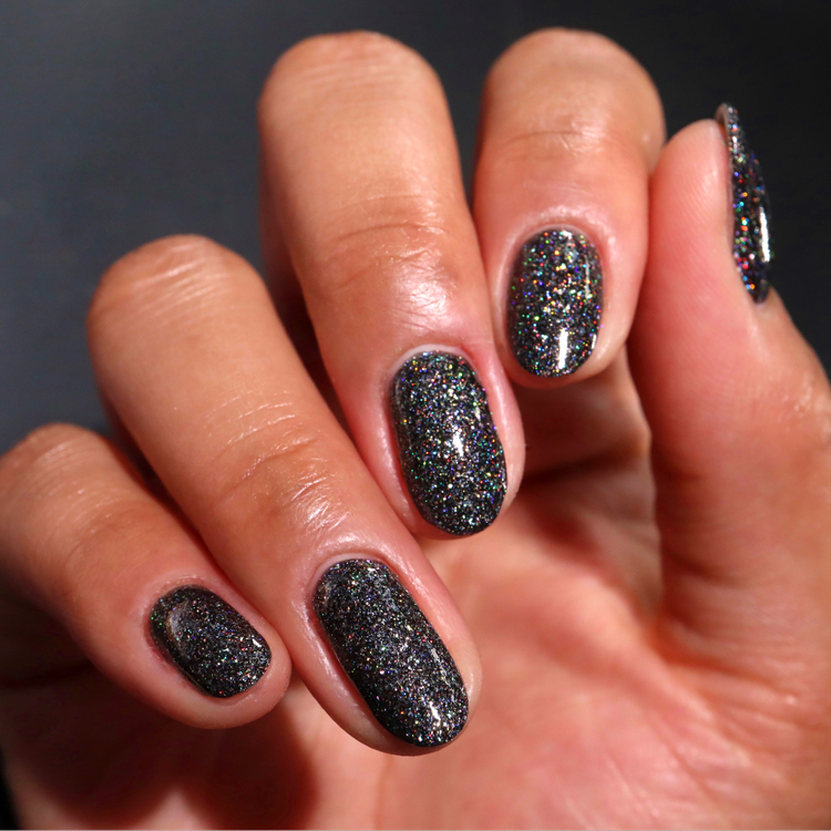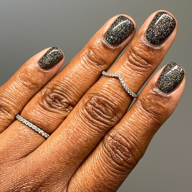 Hematite is a very useful crystal! It is widely known as a calming stone. It's also used to boost self-confidence and can aid with memory. This polish is a creamy black packed with three different holographic elements. Holo flakies, silver holo glitter, and linear holographic shimmer. Opaque in 2 coats.