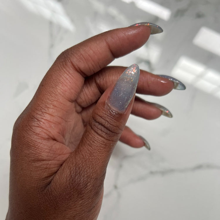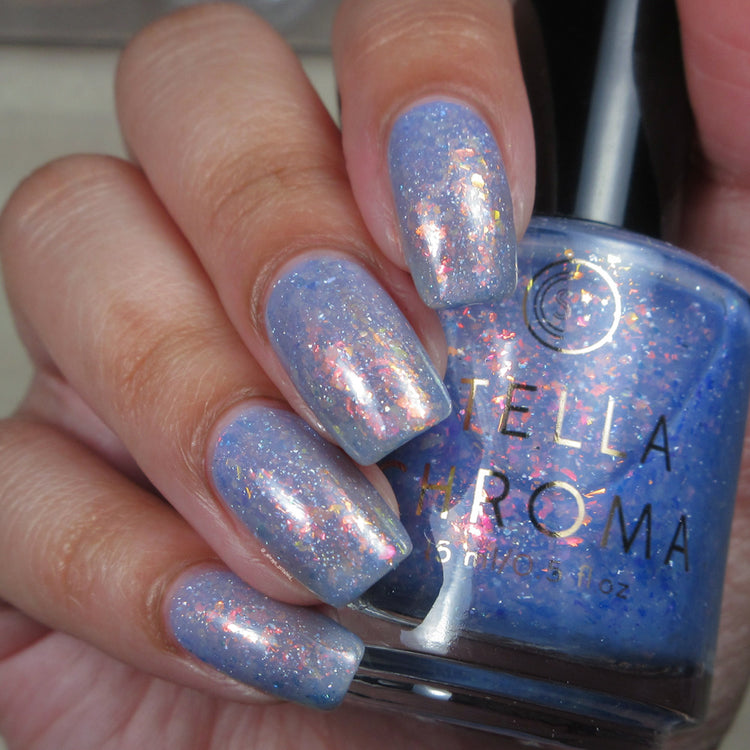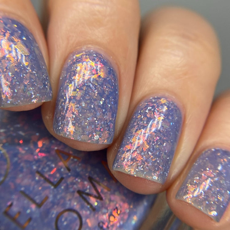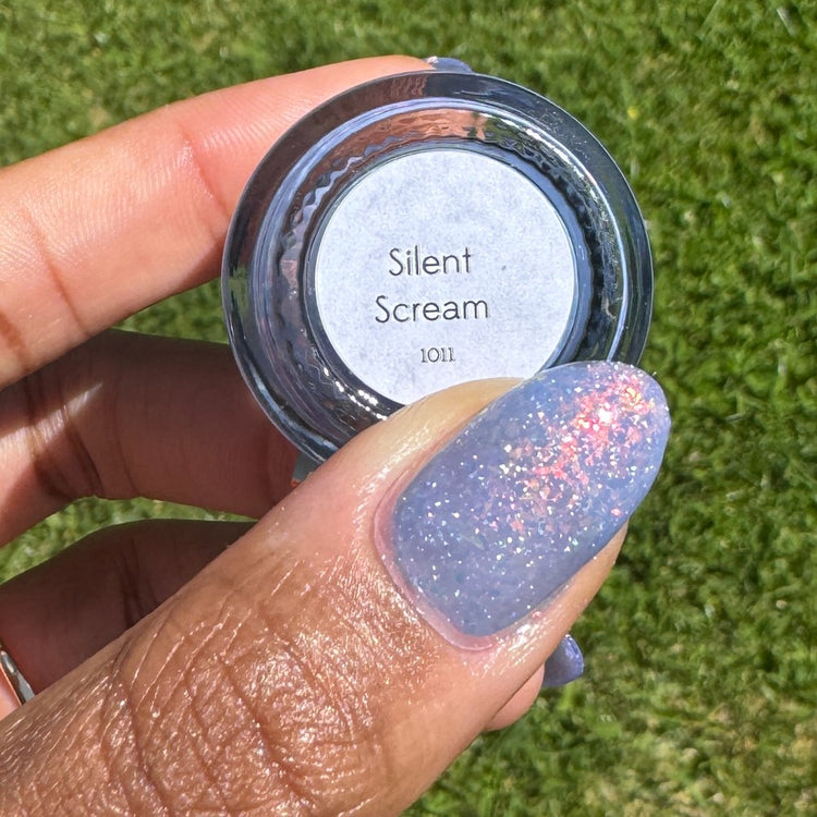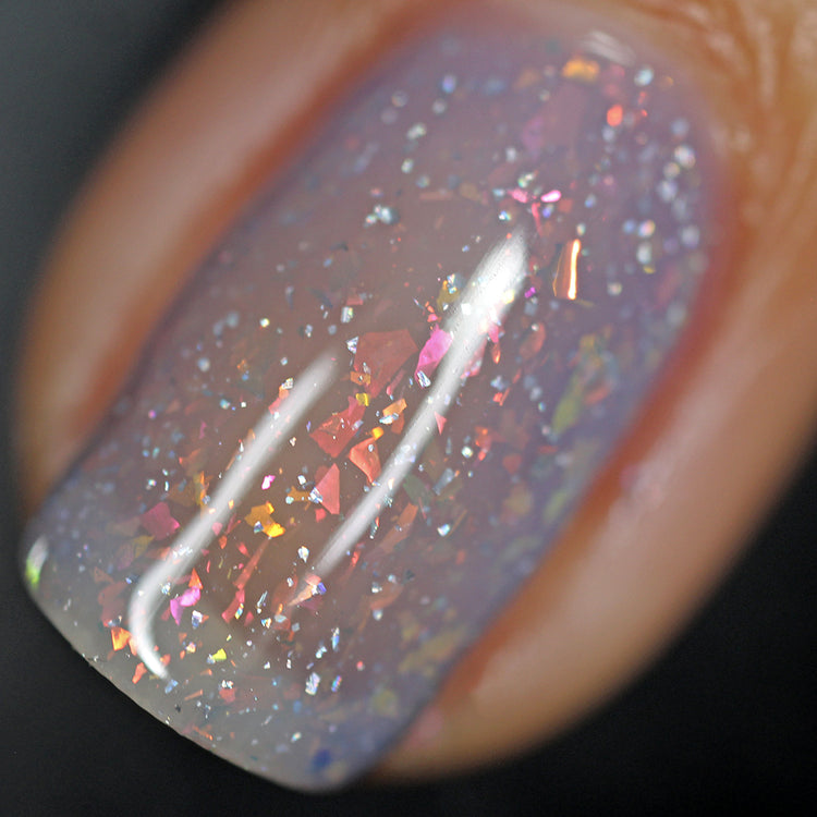 Silent Scream - a sheer periwinkle jelly full to the brim with large pink/orange/yellow flakes and silver holographic flakies. Can be worn with 2-3 coats or as a topper. Inspired by the Taylor Swift song This Love. And a PSA from my niece Brayleigh - Always listen to the "Taylor's Version" of Taylor songs. ;)
