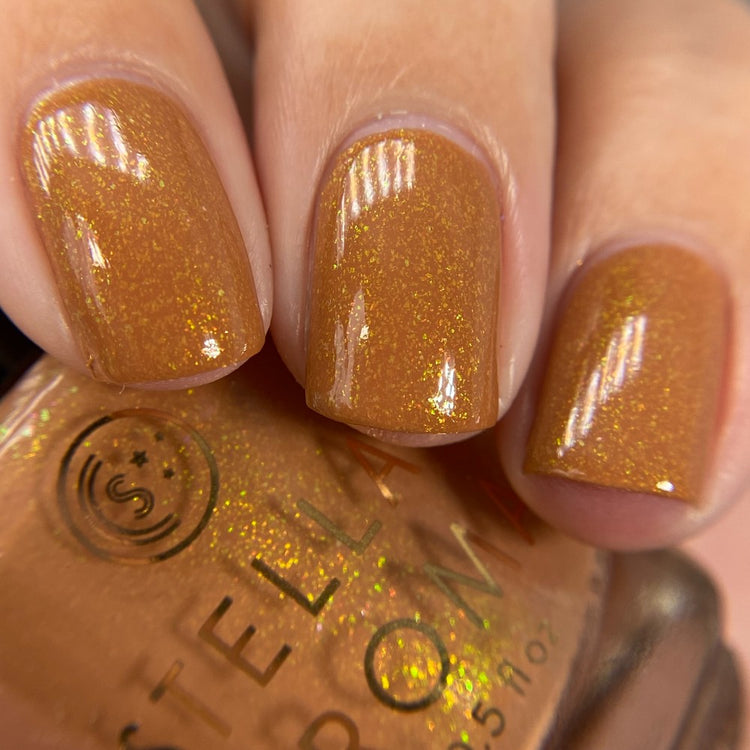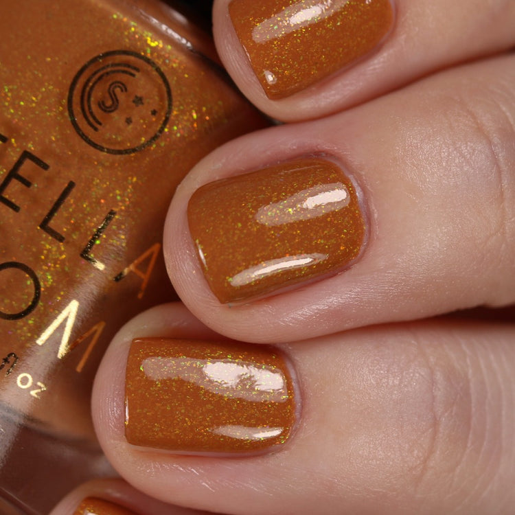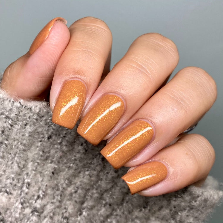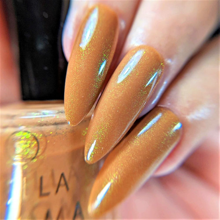 Tell Me Who To Fight - A rich, neutral caramel that looks good on any skin tone. Jazzed up a bit with a green/yellow shimmer. Opaque in 2 easy coats.