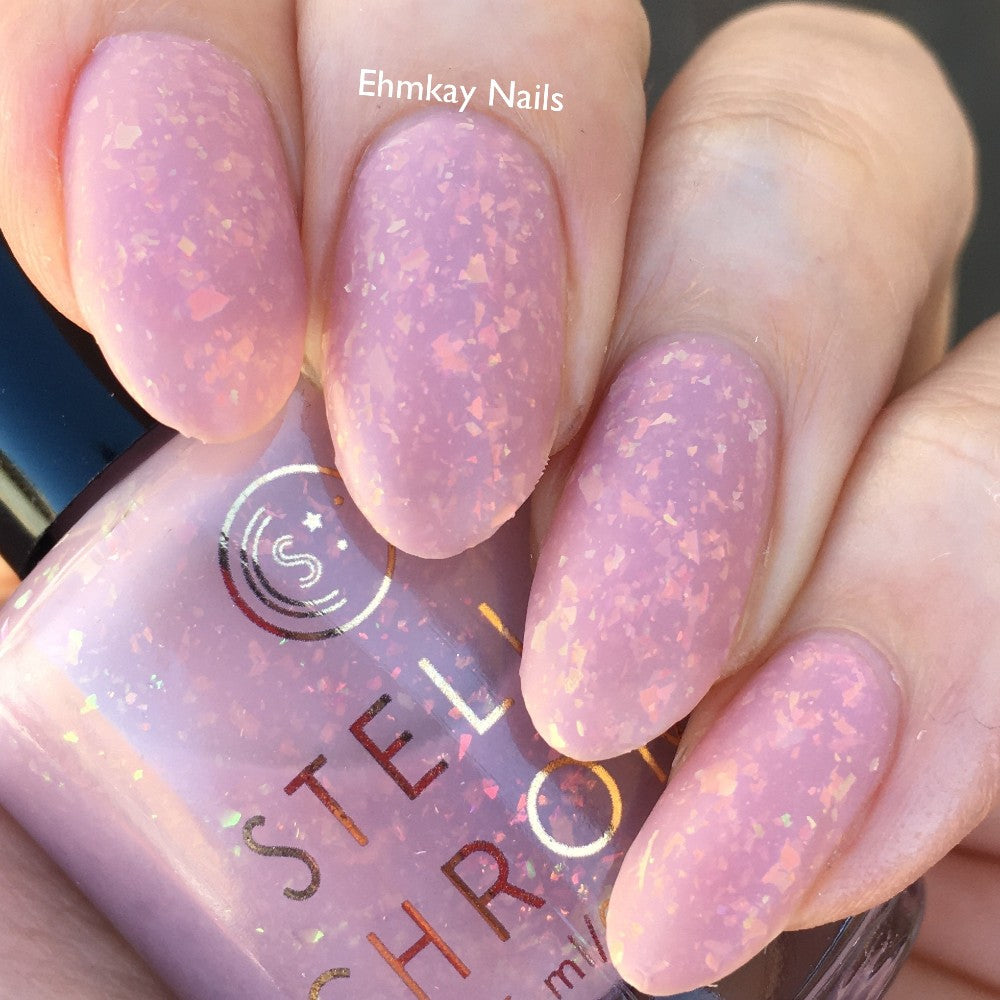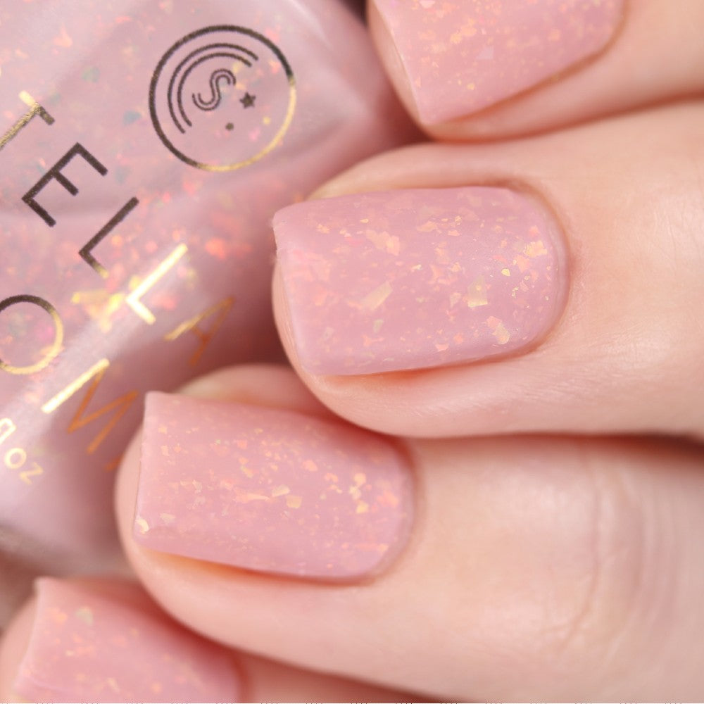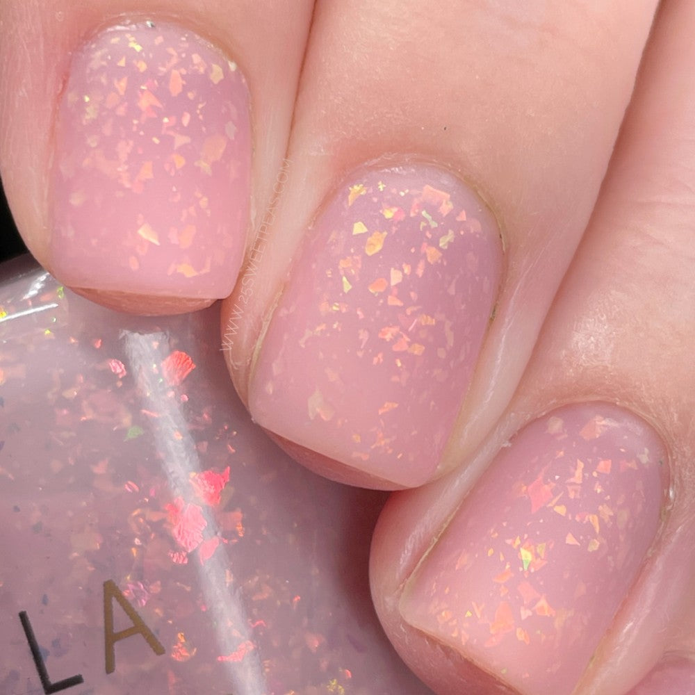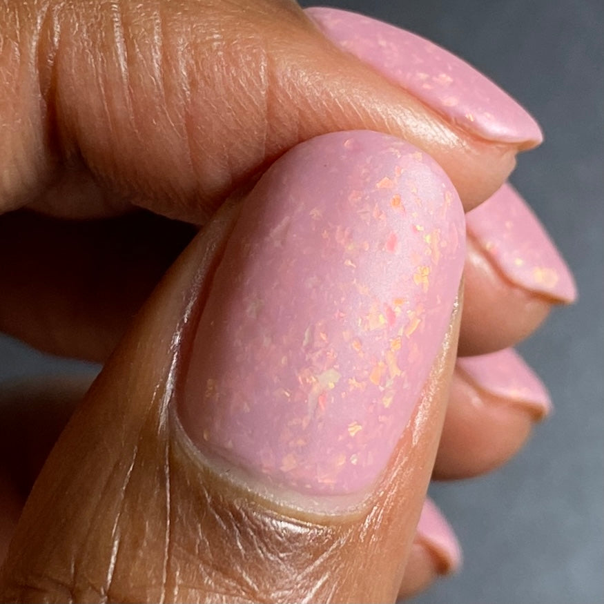 Mid Level Shear - A sheer matte pink highlighted by shifting green/yellow/orange/gold flakies. Inspired by the whispy, feathery clouds that sweep across the sky and the way they light up when the sun goes down.