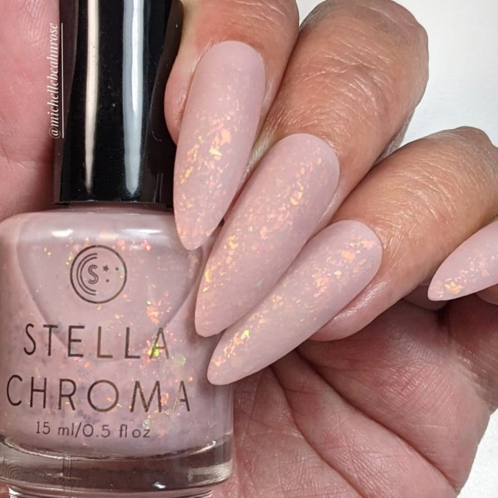 I’m on the fence with this polish. While the matte finish is different, the sparkles under give it a frosted look which is nice. Wish the polish was darker as it almost blends into my skin. The polish is thin, coats evenly, and dries fast. I have purchased many polishes from this vendor and they are always arrive beautifully wrapped.