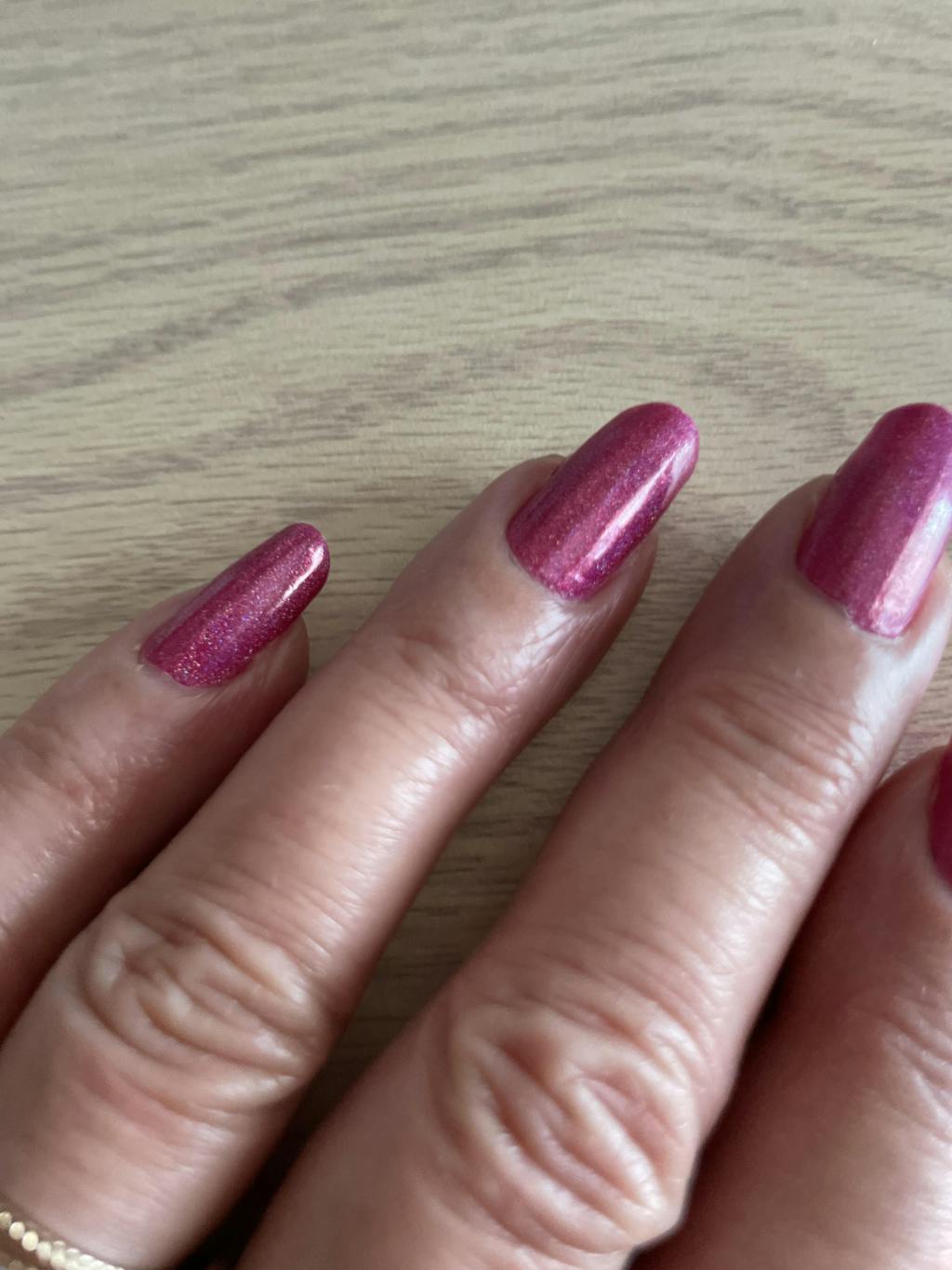 It is SO gorgeous! I get SO many compliments on it! Summer Sandals is a vivid berry pink packed with holographic sparkle that comes alive in the sunlight. 2-3 coats and you're done! It looks different on the bottle than on your nails. Give yourself a manicure before you make up your mind about it.